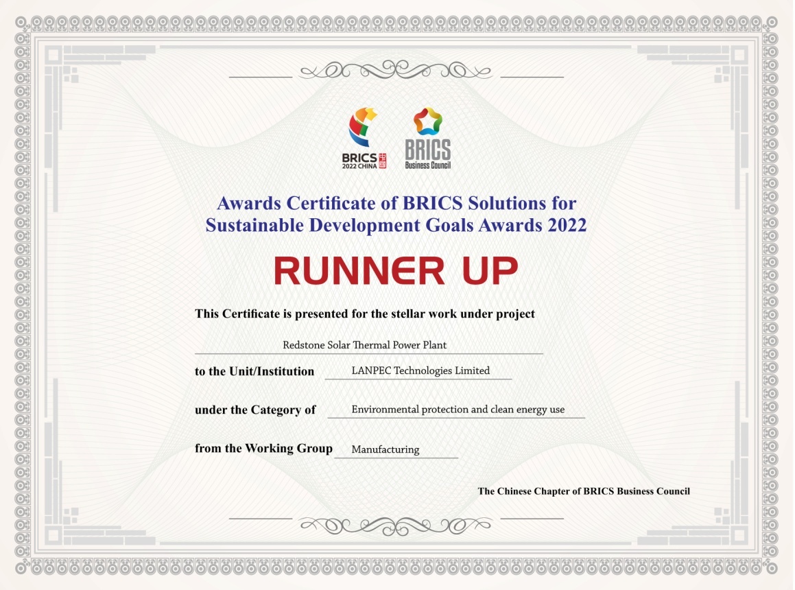 南非紅石光熱電站項(xiàng)目獲得金磚國家可持續(xù)發(fā)展解決方案二等獎(jiǎng)