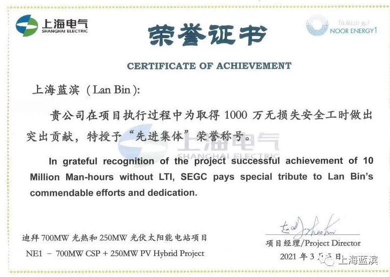 迪拜700MW光熱和250MW光伏太陽能電站項(xiàng)目先進(jìn)集體榮譽(yù)證書