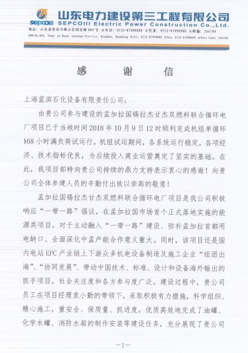 總包方頒發(fā)的孟加拉希拉杰甘杰項(xiàng)目感謝信