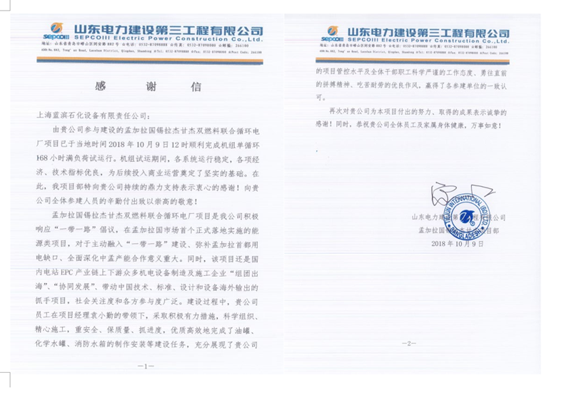 總包方頒發的孟加拉希拉杰甘杰項目感謝信