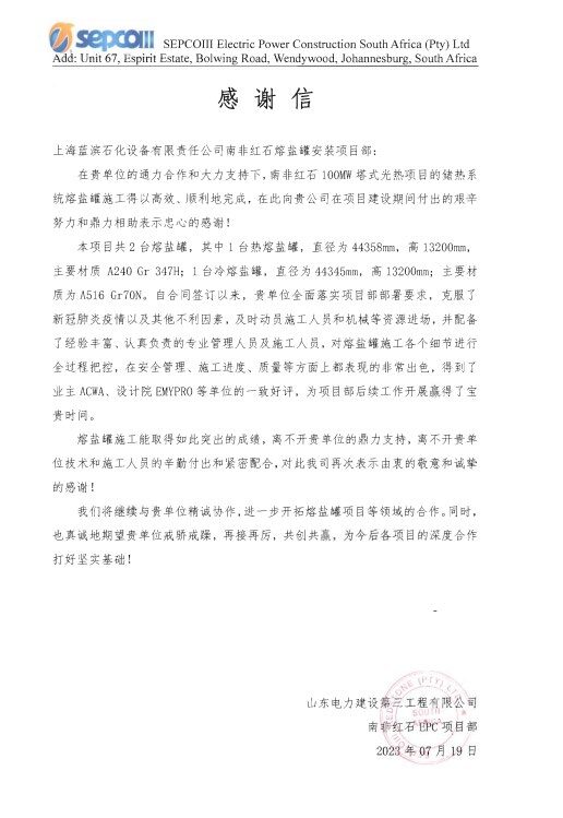 ????????????????????總包方頒發(fā)的南非紅石光熱項目感謝信