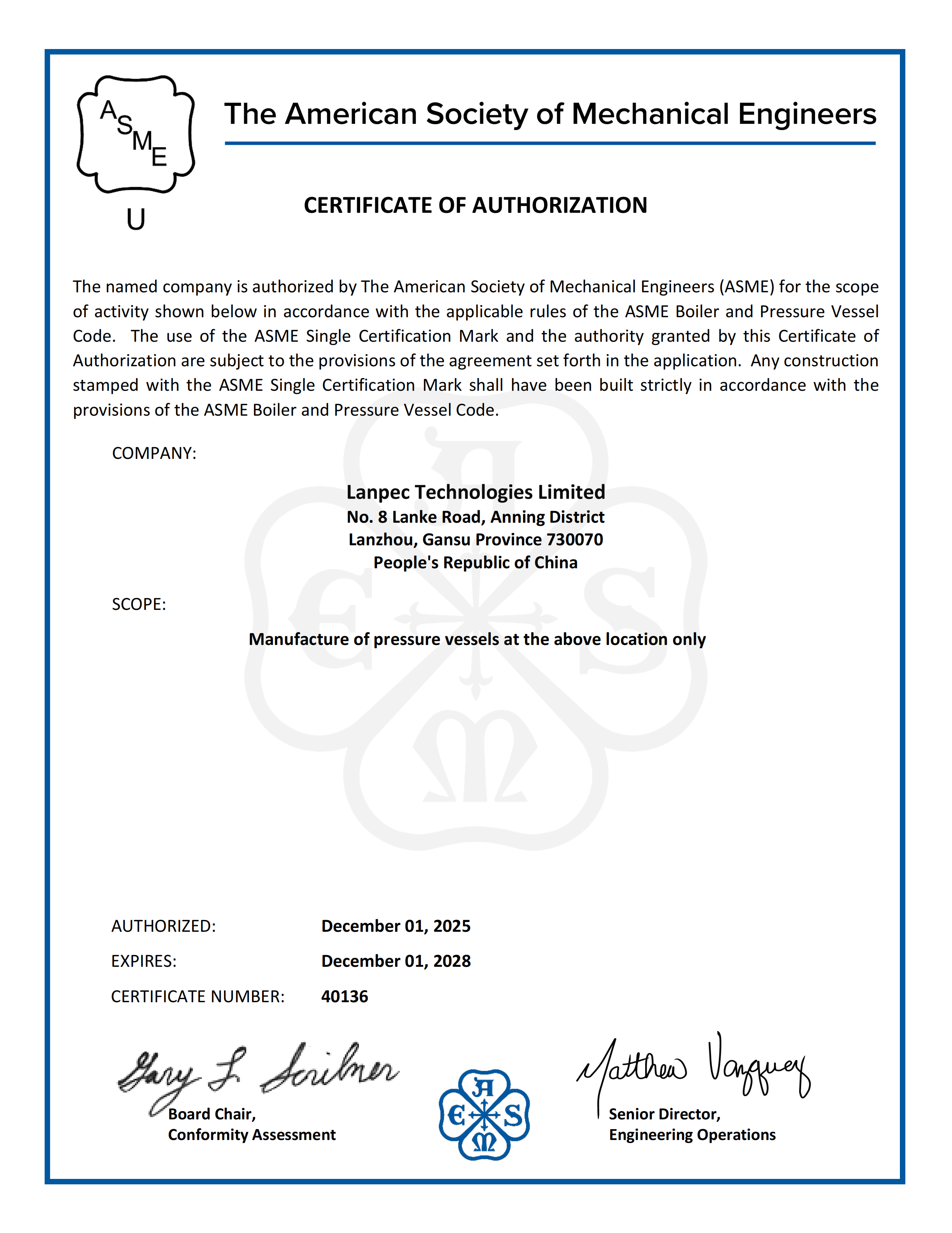 ASME U 鋼印授權證書