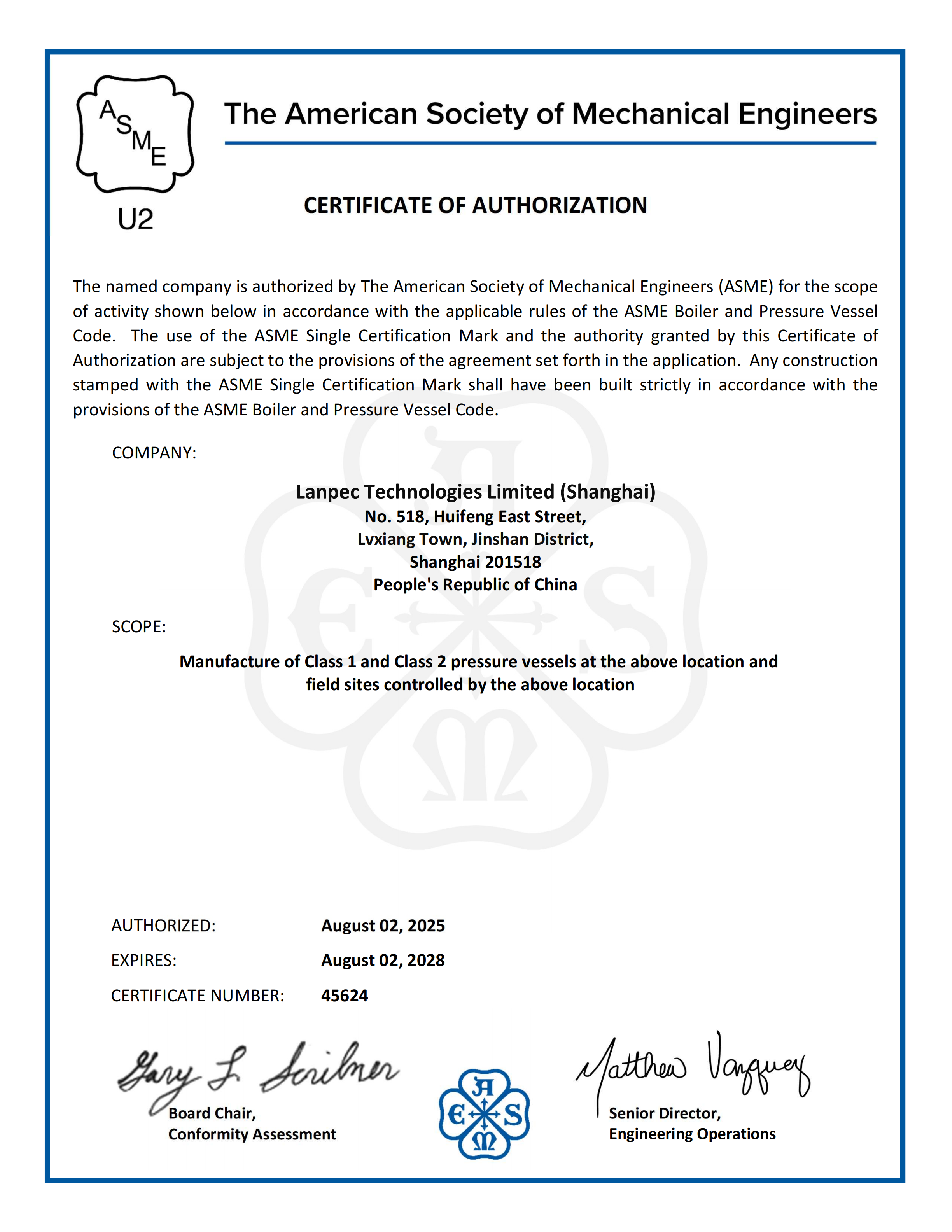 ASME U2鋼印授權證書