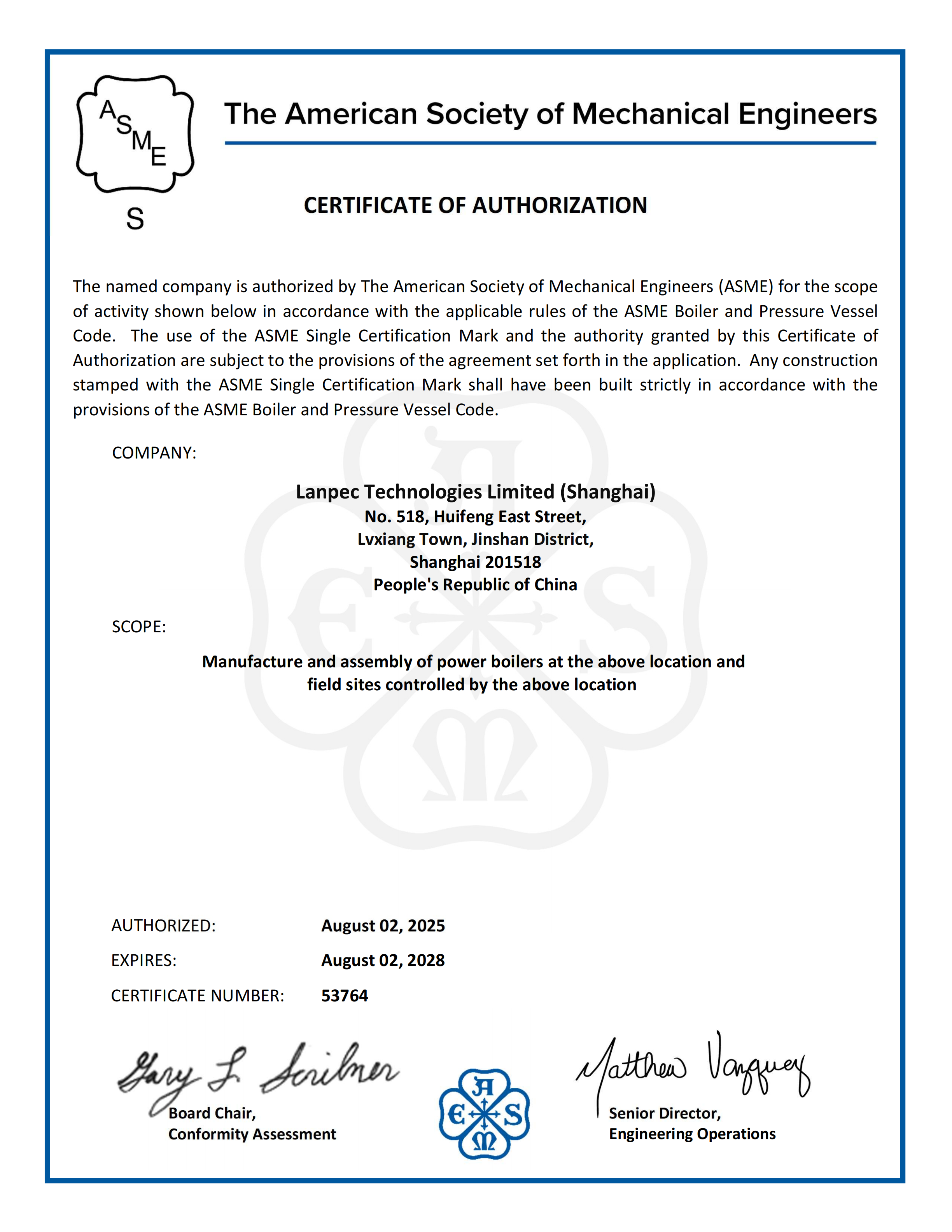 ASME S鋼印授權證書